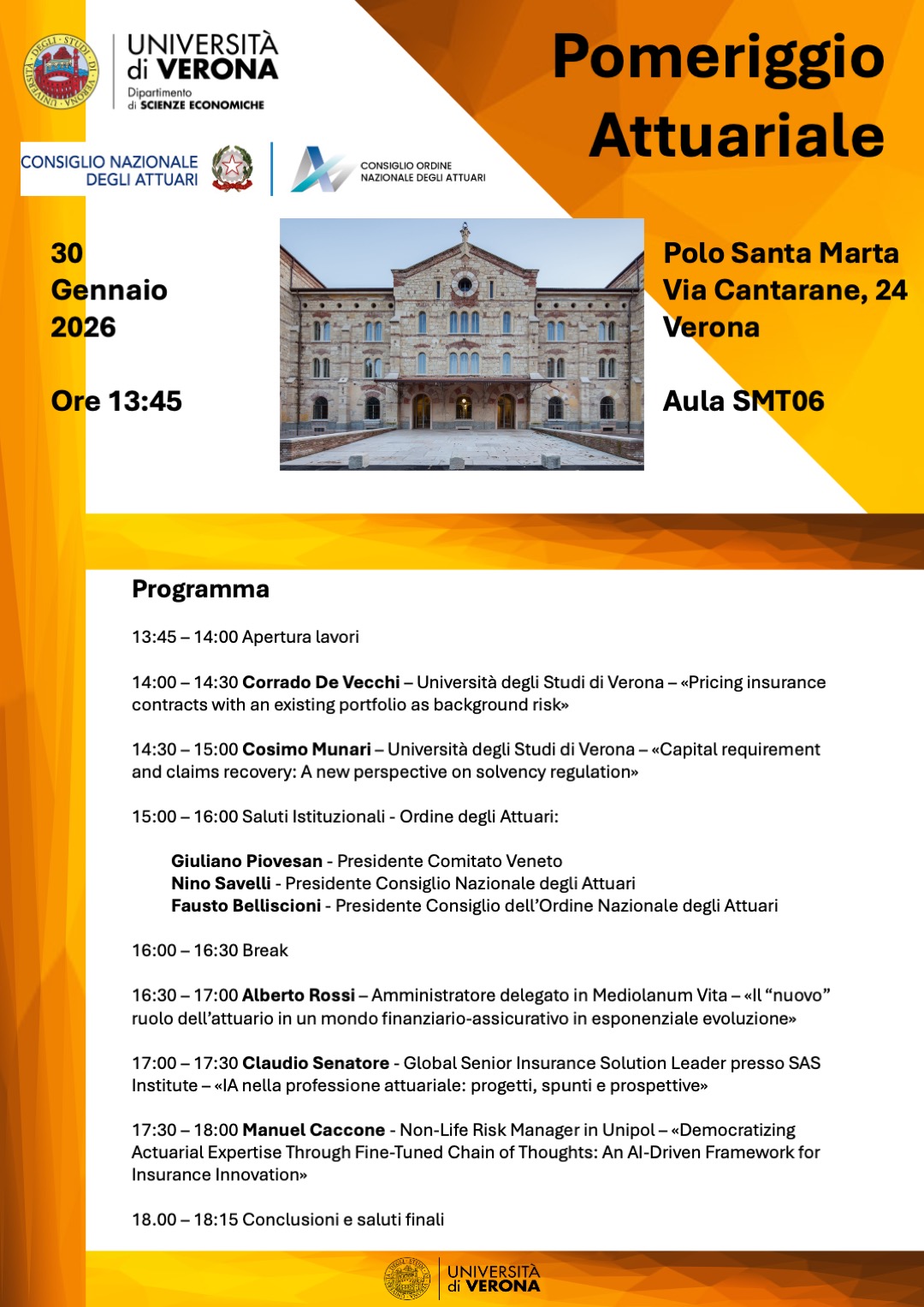Il 30 gennaio 2026, a partire dalle 13:45, in aula SMT06, il Dipartimento di Scienze Economiche, in collaborazione con il Consiglio Nazionale degli Attuari e del Consiglio Ordine Nazionale degli Attuari, ospiterà un incontro sui temi contemporanei della professione attuariale. Gli interventi spazieranno dall’impatto dell’IA sulla professione, alla valutazione e risk management in ambito assicurativo. L’ingresso è libero.